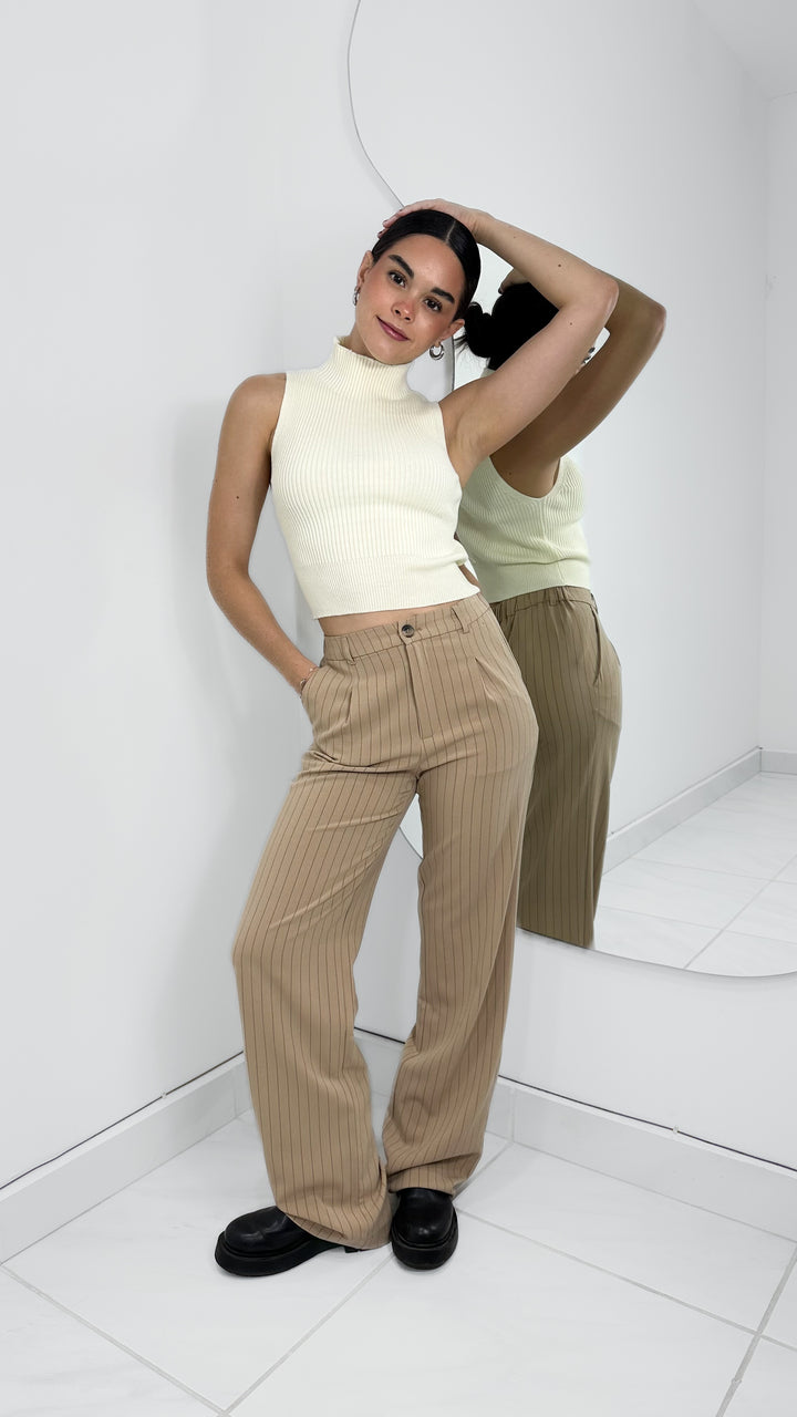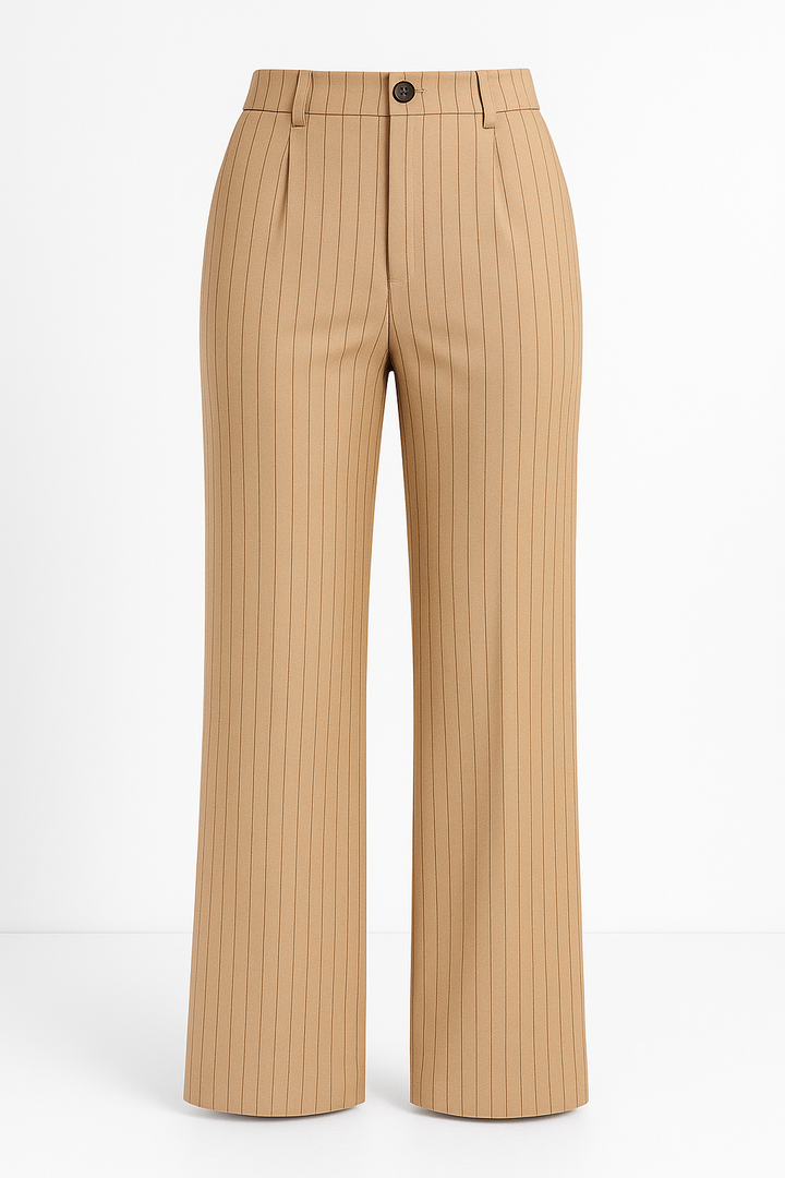 Pantalón en color camel con diseño clásico y sofisticado. Confeccionado en tela de caída estructurada con estampado de rayas finas verticales que estilizan la silueta. Presenta pretina con trabillas, bolsillos discretos laterales y cierre frontal con botón. Su corte recto y elegante lo convierte en una prenda versátil, ideal para elevar looks de oficina o para un estilo casual chic con blazer o top ligero.