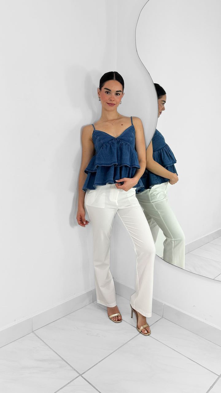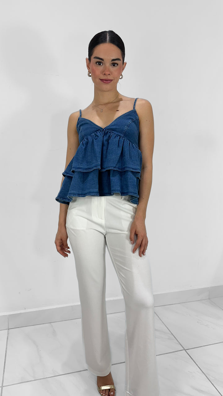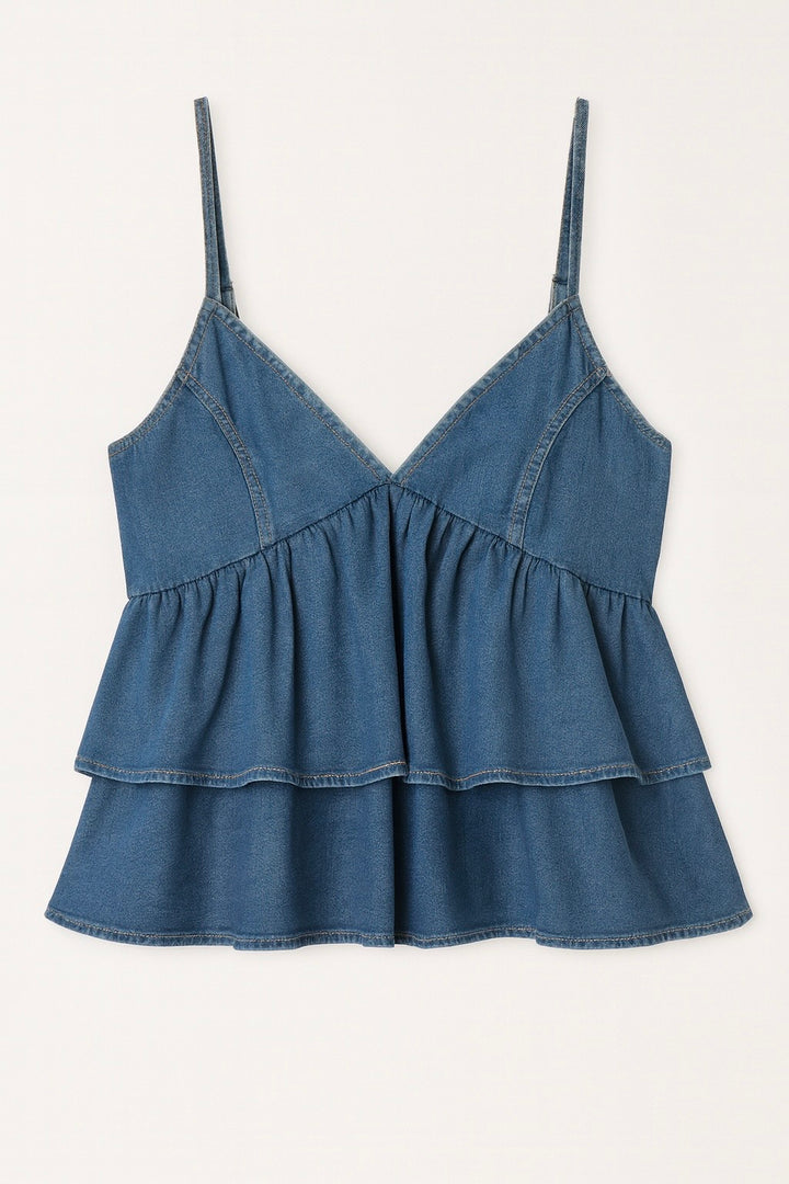 Blusa en mezclilla azul con tirantes delgados y escote en “V”. Presenta un diseño femenino con doble volante en el bajo que aporta movimiento y un estilo fresco. Su silueta suelta y ligera la convierte en una prenda versátil y cómoda, ideal para la temporada.