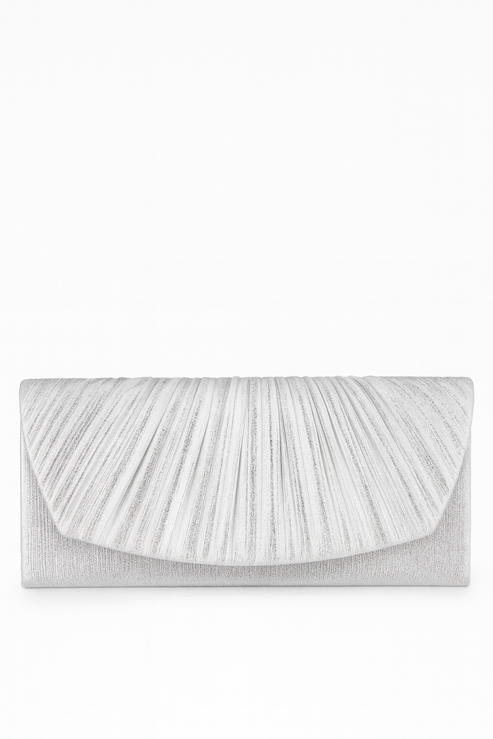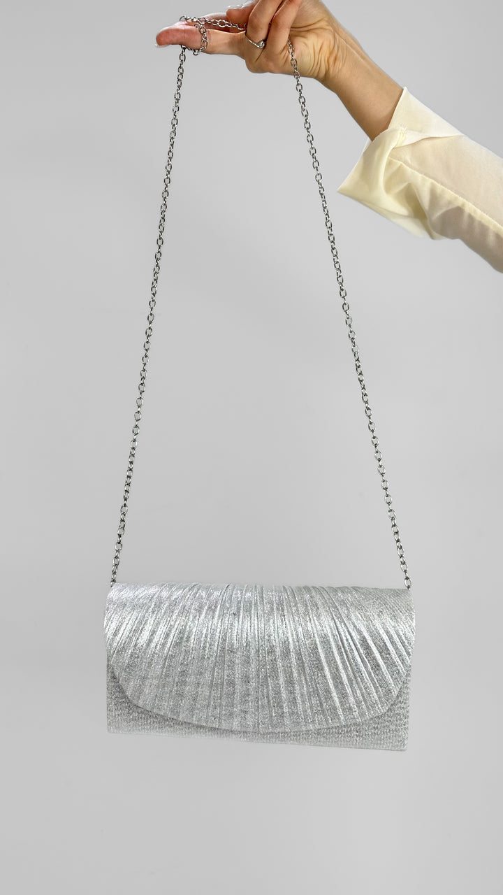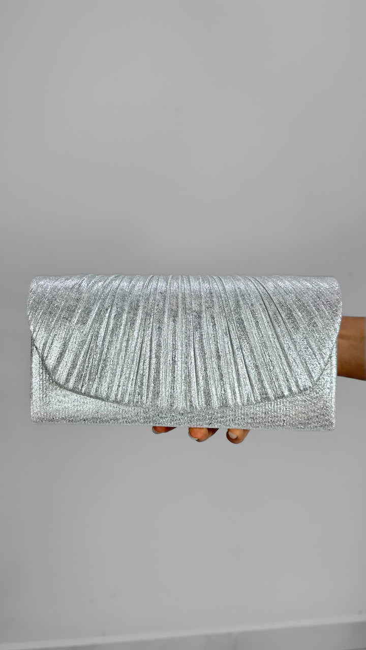 Bolsa tipo clutch en tono plateado con acabado brillante y textura plisada en la solapa frontal, que le aporta un aire sofisticado y glamuroso. Su diseño estructurado es ideal para ocasiones especiales, desde cenas formales hasta eventos de noche. Compacta y versátil, es el accesorio perfecto para elevar cualquier look con un toque de lujo y distinción.