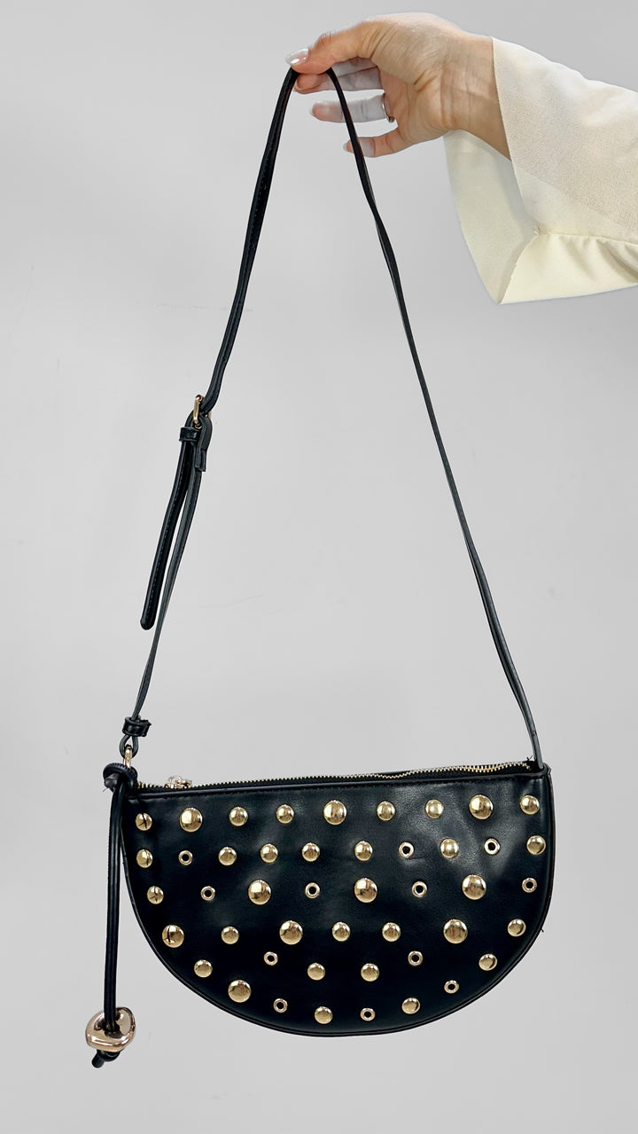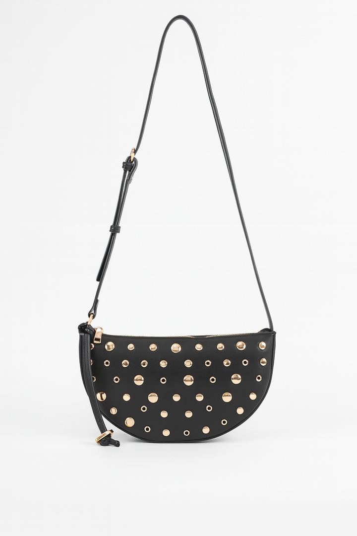 Bolsa media luna negra con remaches metálicasBolsa estilo media luna en tono negro, diseñada con aplicaciones metálicas doradas al frente que aportan un toque moderno y sofisticado. Cuenta con correa ajustable...