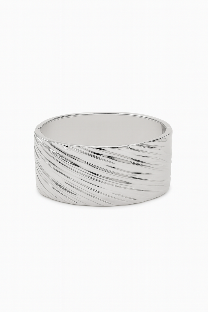 Pulsera rígida en tono plateado con acabado brillante y diseño texturizado en relieve que aporta un efecto sofisticado y moderno. Su estilo ancho la convierte en un accesorio llamativo y versátil, ideal para complementar looks tanto elegantes como casuales. Perfecta para usar de día o de noche, añadiendo un toque chic a tu outfit.