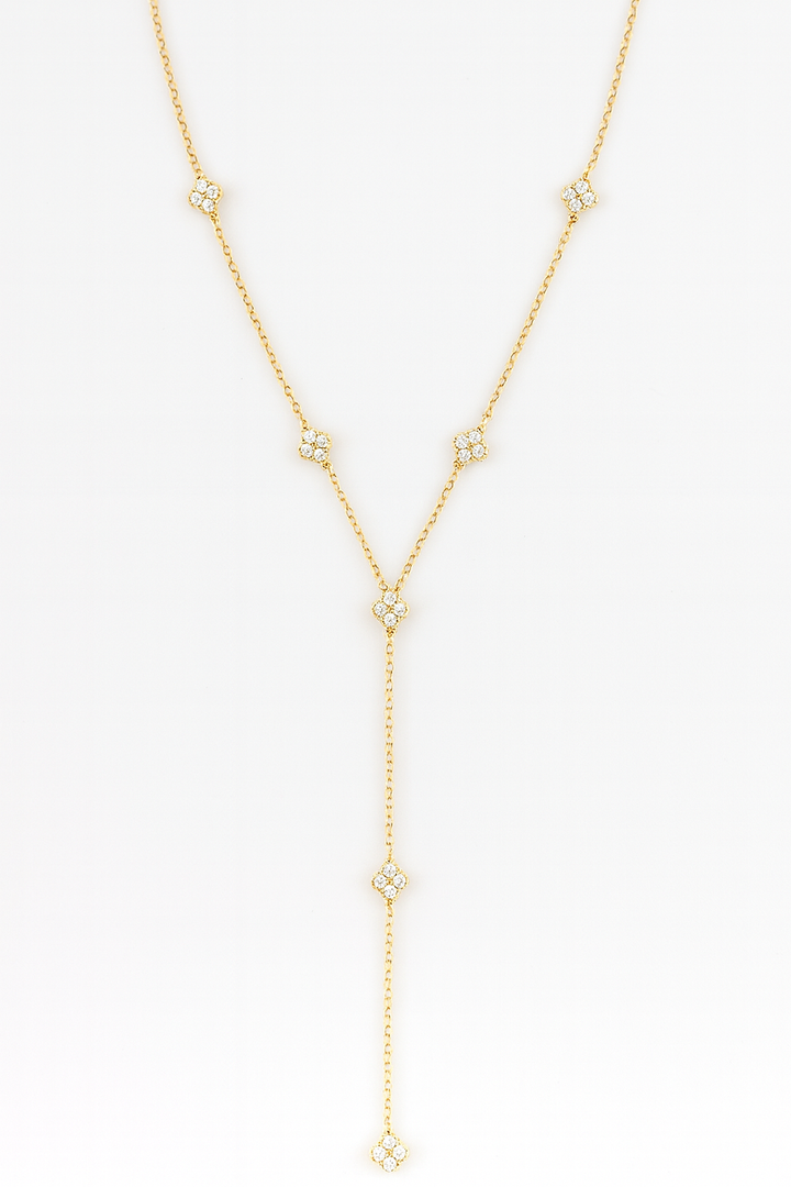 Collar en tono dorado con diseño elegante en forma de “Y”. La cadena fina se adorna con pequeños dijes florales incrustados de pedrería brillante, que aportan un toque sofisticado y femenino. Su caída estilizada lo convierte en el accesorio perfecto para resaltar el escote y elevar cualquier look, desde outfits casuales hasta atuendos de noche.