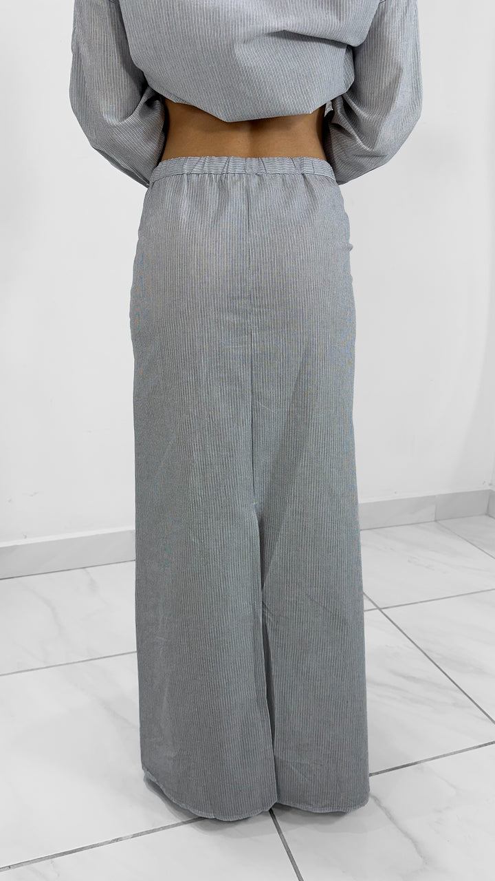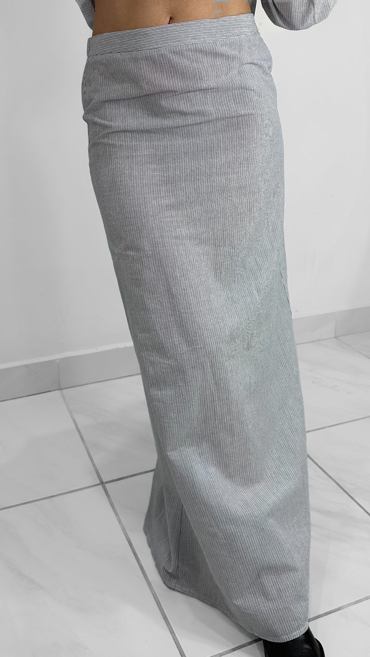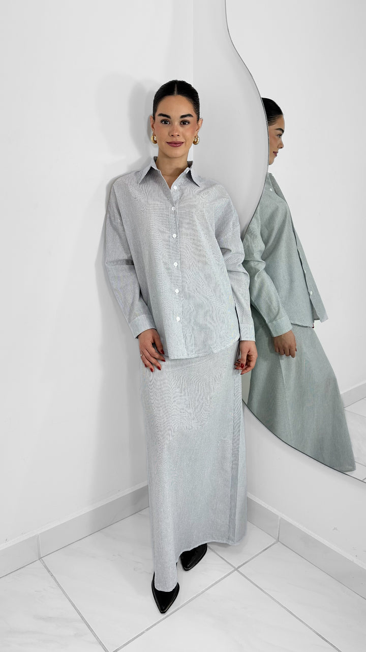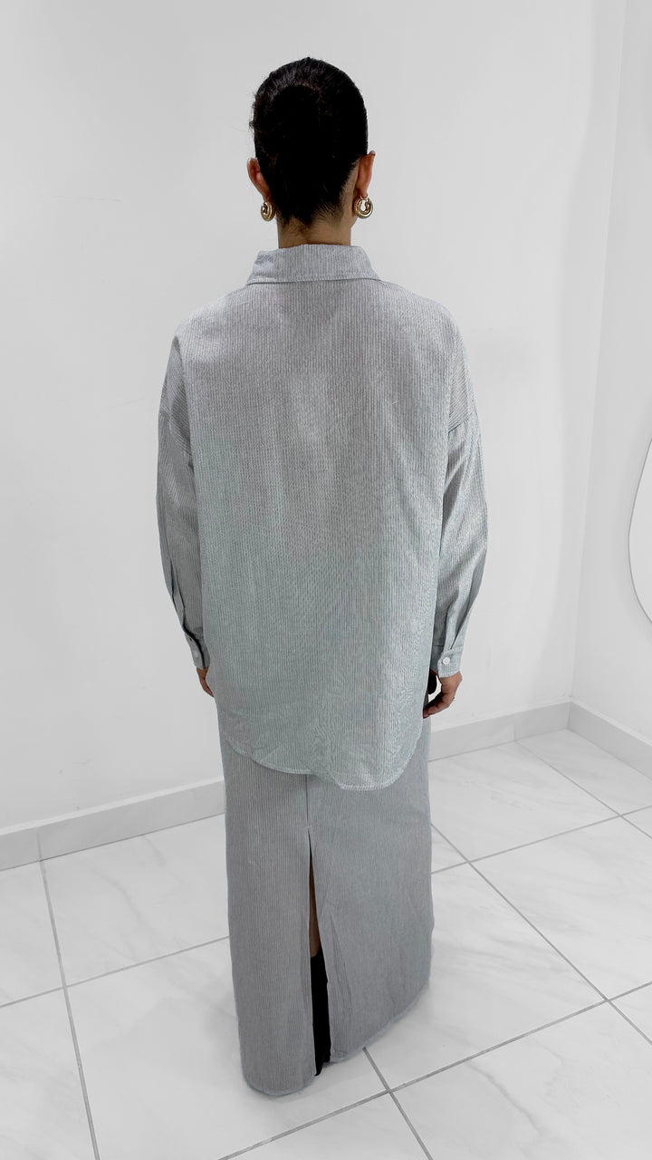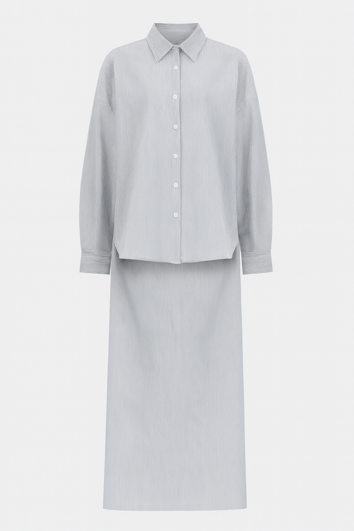 Minimalismo y estilo en un solo set. Este conjunto camisero en rayas incluye una camisa de manga larga con botones frontales y cuello clásico, acompañada de una falda midi recta a juego. Su diseño relajado y elegante lo convierte en un outfit versátil para usar tanto en el día como en la noche.