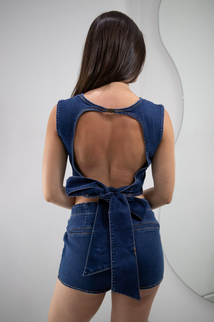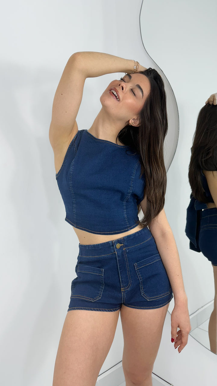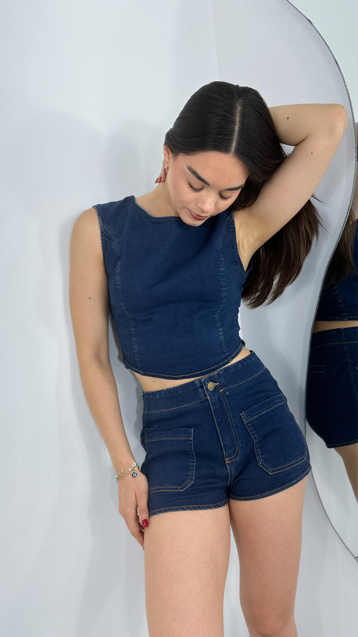 Este short de mezclilla azul oscuro es un básico moderno y favorecedor. Su diseño de tiro alto resalta la cintura y estiliza la silueta, mientras que los bolsillos delanteros de parche y las costuras en contraste le añaden un toque casual y trendy. Con cierre de botón metálico y cremallera, es una prenda versátil y cómoda, ideal para combinar con tops, blusas ligeras o bodysuits. Perfecto para looks casuales y frescos que no pasan de moda.