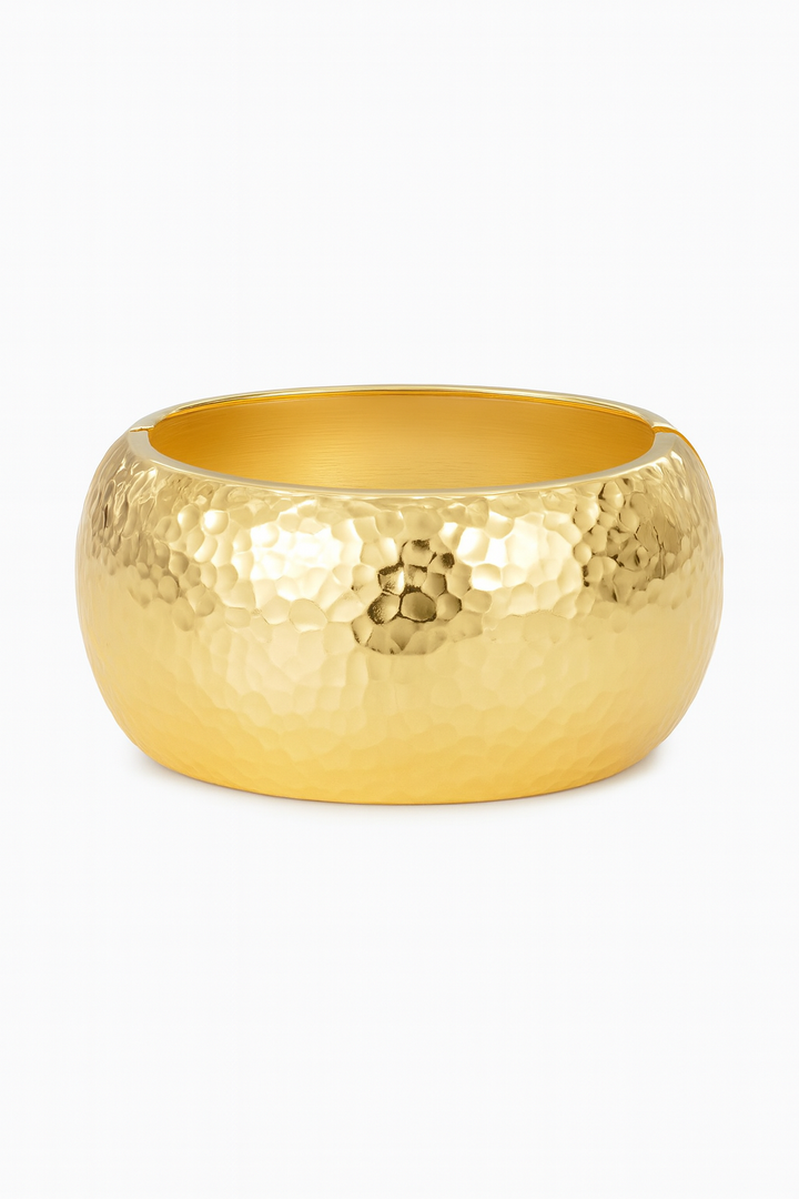 Pulsera rígida en tono dorado con acabado martillado que aporta un estilo sofisticado y moderno. Su diseño ancho y brillante la convierte en una pieza llamativa, ideal para elevar cualquier look. Perfecta para combinar en ocasiones especiales o para dar un toque elegante a tus outfits del día a día.