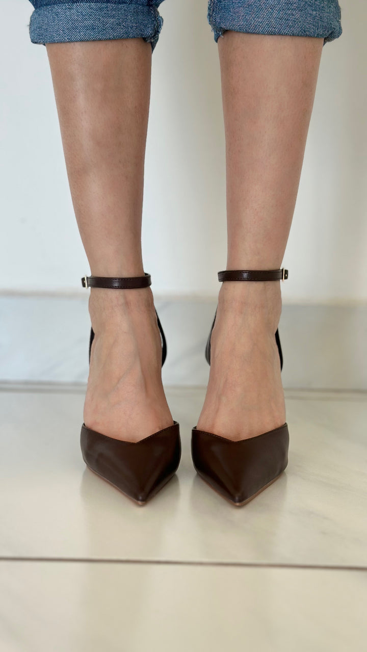 Un clásico sofisticado con un toque moderno. Este tacón stiletto en acabado café presenta un diseño elegante de punta fina y pulsera al tobillo ajustable con hebilla dorada que aporta seguridad y estilo. Su tacón metálico dorado alto estiliza la figura y añade un detalle de lujo que lo convierte en el complemento ideal para elevar cualquier look de noche o de ocasión especial. Perfectos para combinar con vestidos, faldas o pantalones sastre, logrando un outfit refinado y lleno de carácter. - Altura del tacón 11 cm