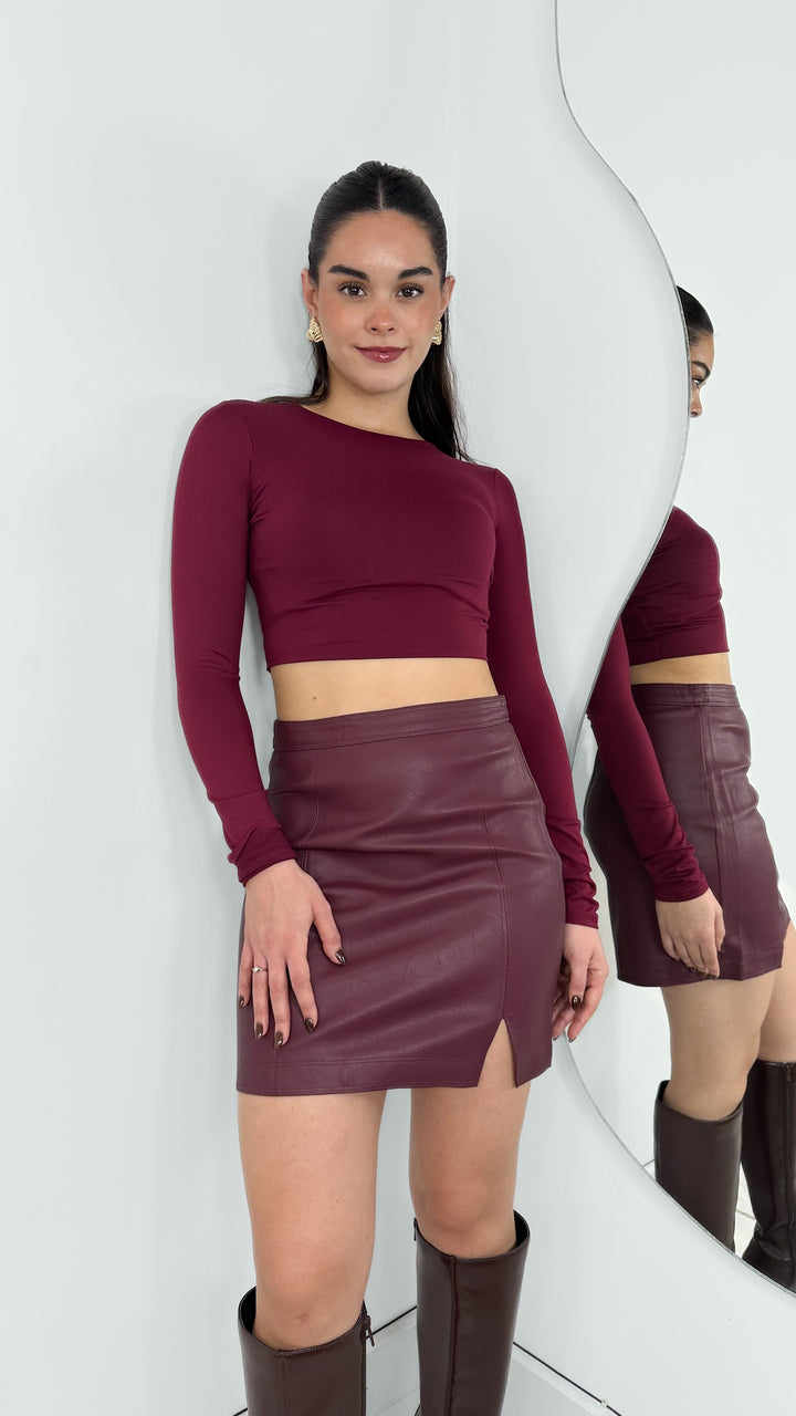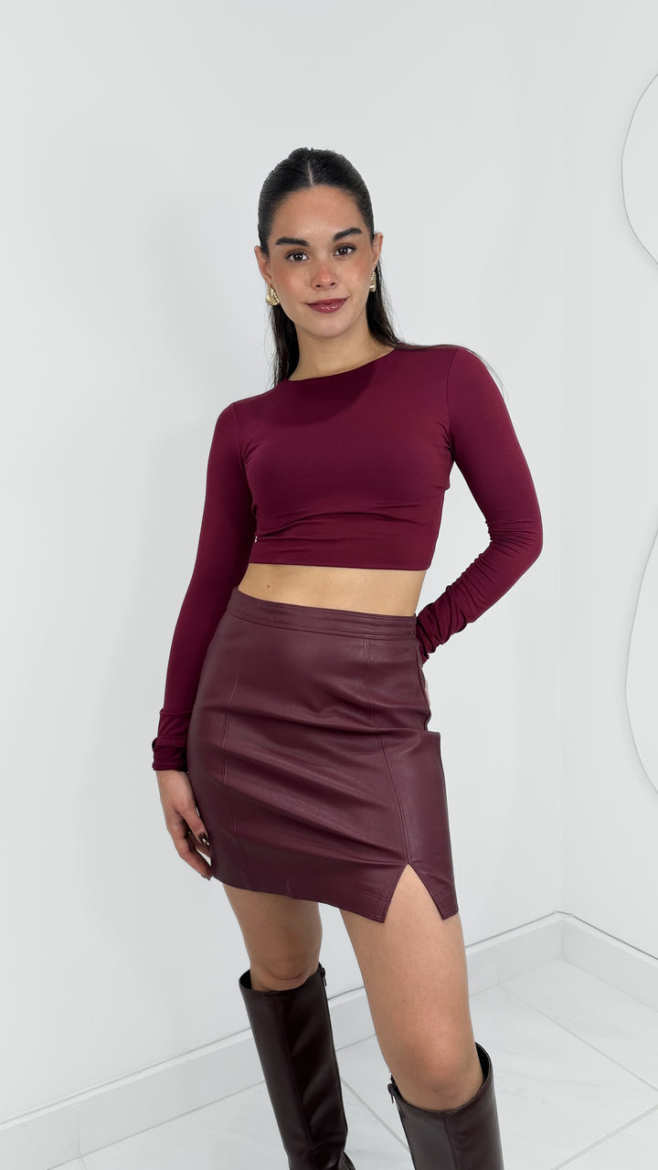 Un básico con un toque atrevido. Este top en tono vino está diseñado con corte crop y manga larga ajustada que estiliza la figura. Su tejido de acabado suave ofrece comodidad y un ajuste perfecto, ideal para combinar con faldas, jeans o pantalones de tiro alto. Una prenda versátil que se adapta tanto a looks casuales como de noche.