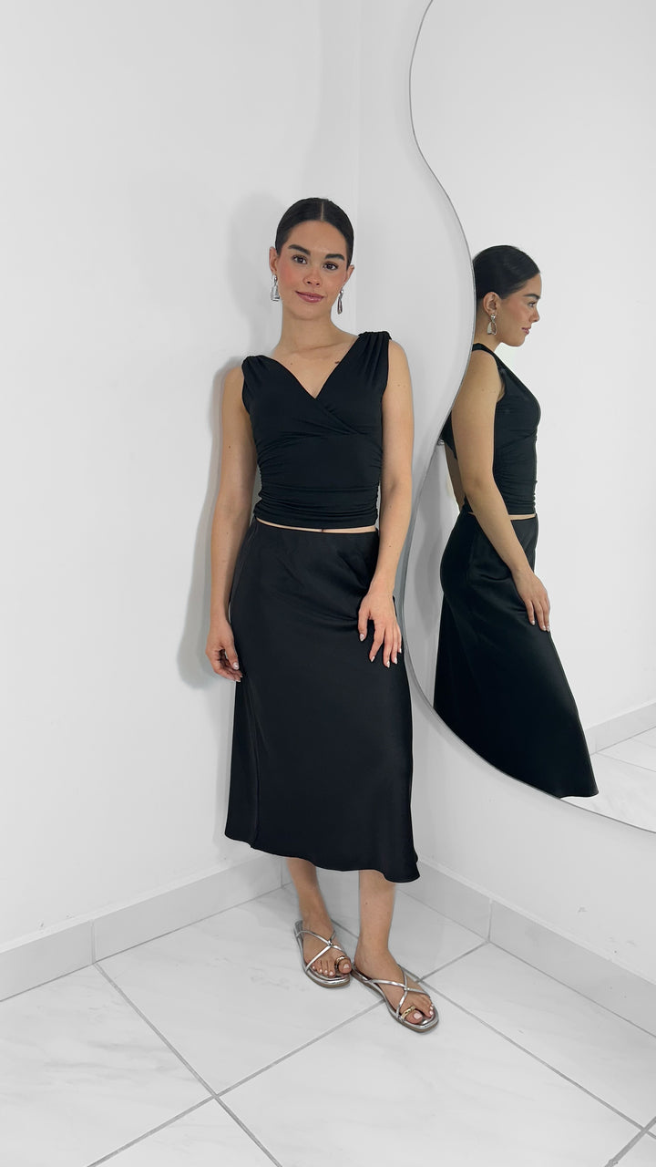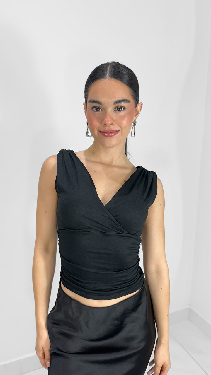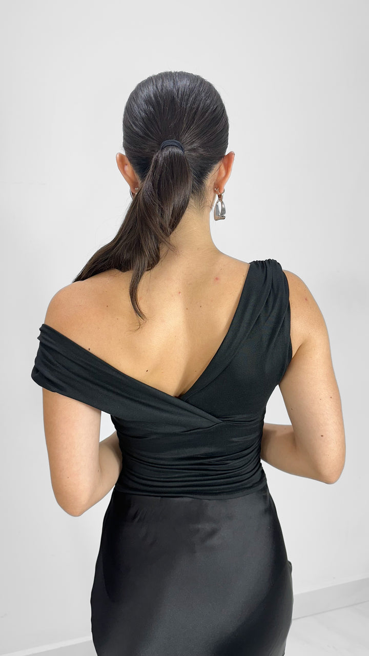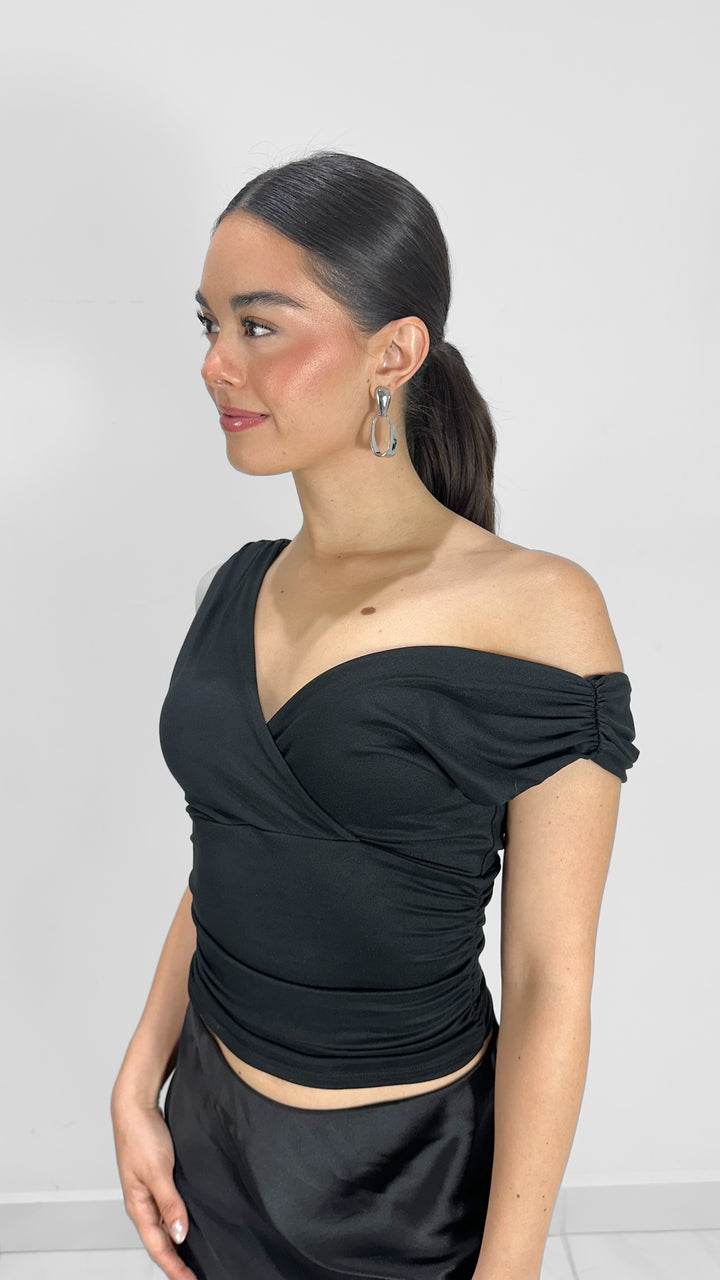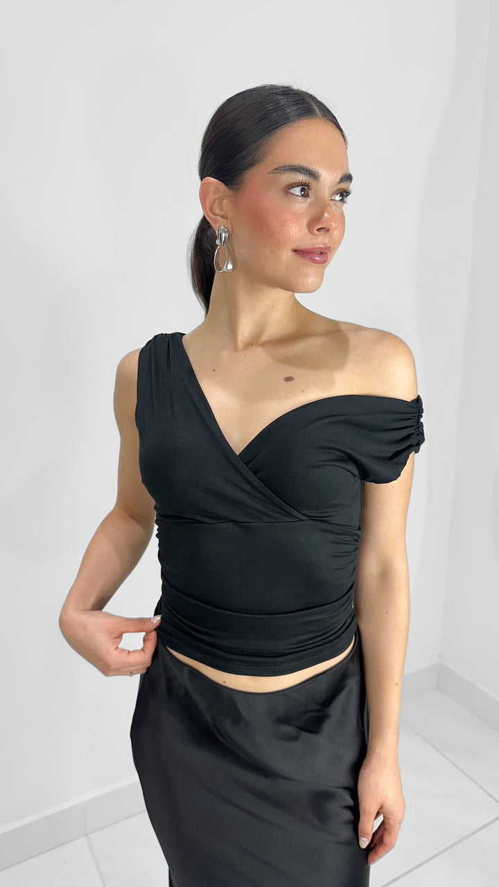 Blusa en color negro con diseño asimétrico de un solo hombro y escote cruzado en “V”. Presenta frunces laterales que estilizan la silueta y aportan un fit favorecedor. Confeccionada en tela suave y elástica, combina comodidad con un estilo moderno y sofisticado.