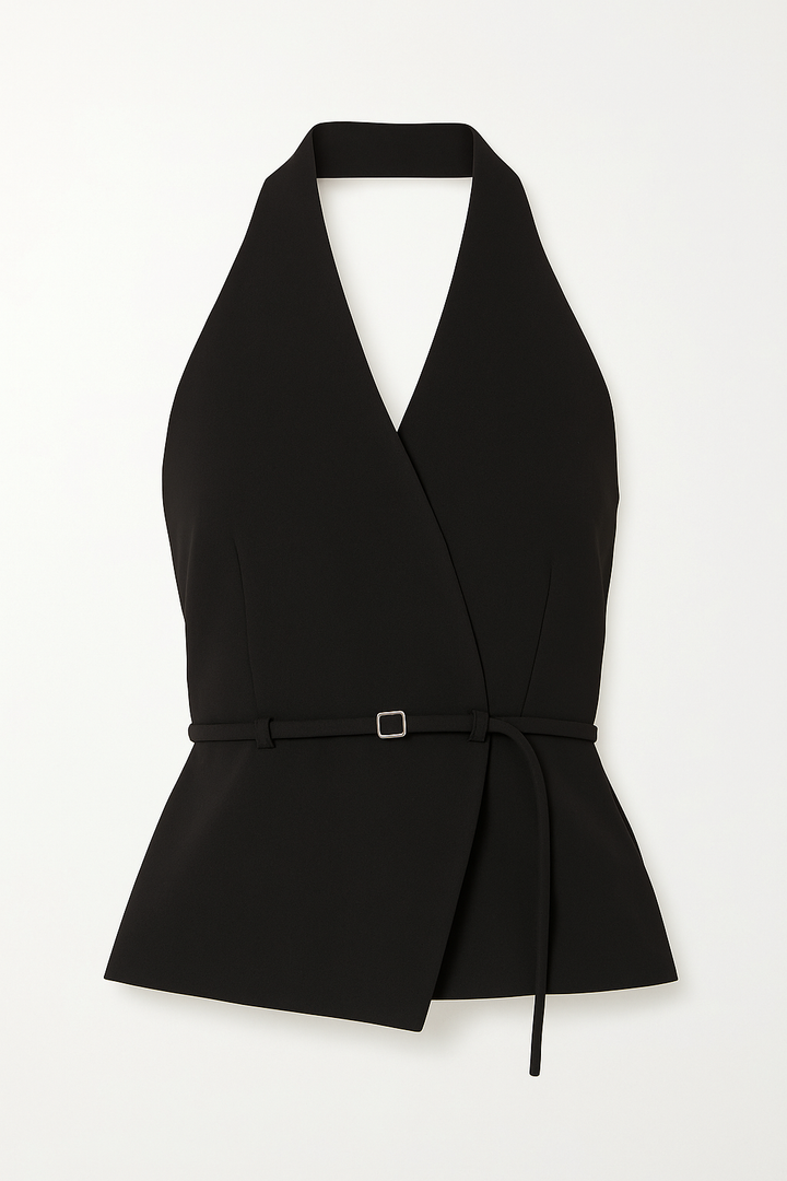 Top halter elegante en color negro con diseño cruzado al frente y escote profundo en “V”. Incluye un cinturón delgado con hebilla metálica que define la cintura y estiliza la silueta. Su corte recto y minimalista lo convierte en una prenda versátil, ideal para looks de noche, eventos especiales o para elevar un outfit casual con un toque sofisticado.