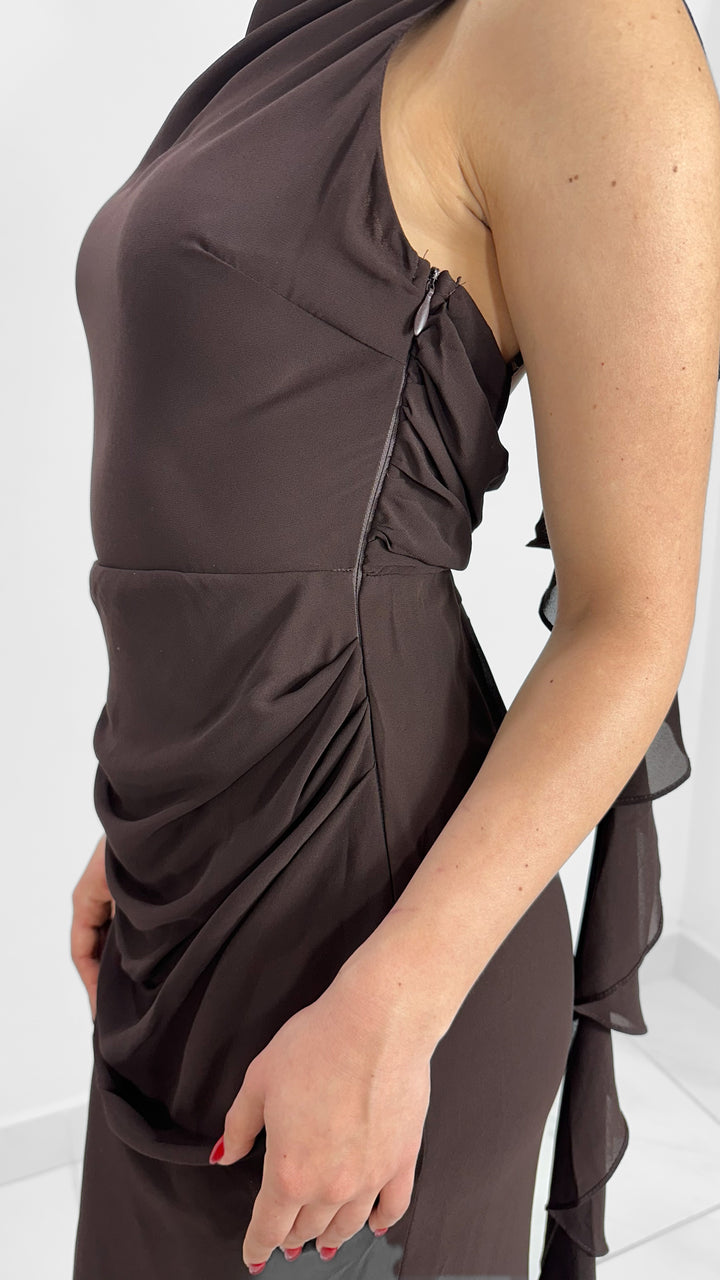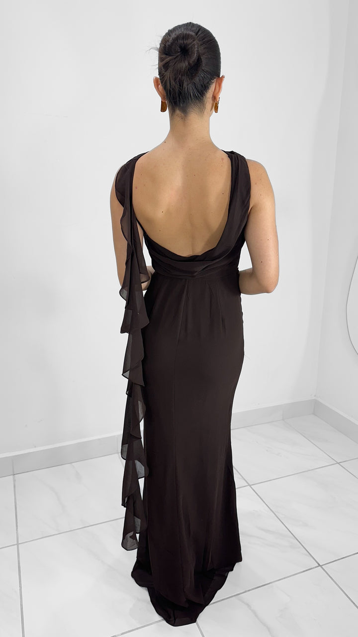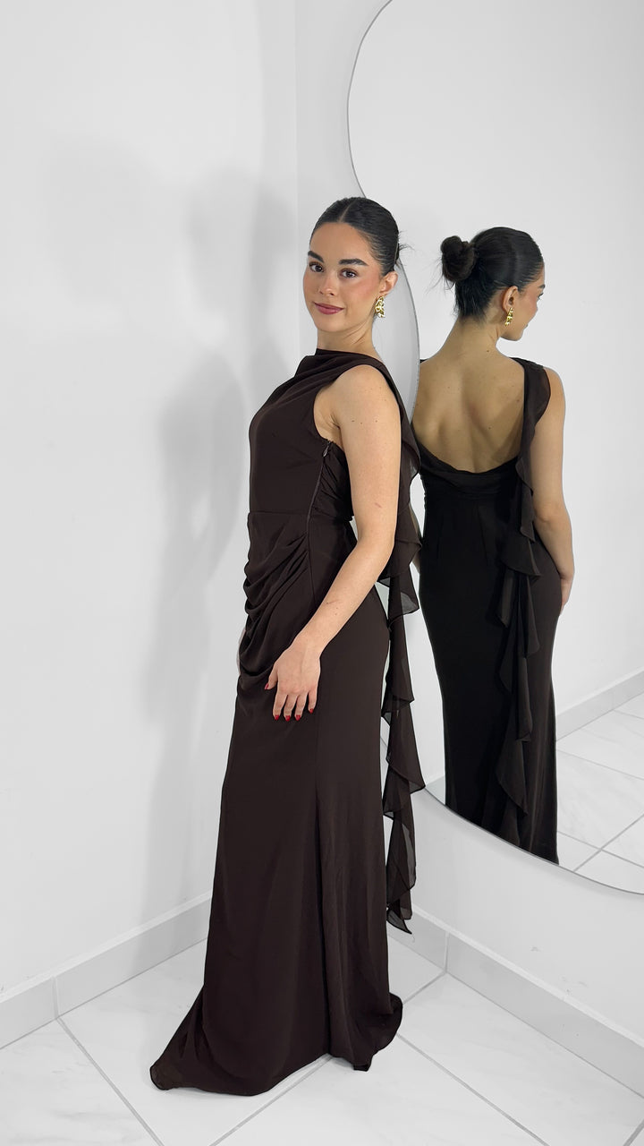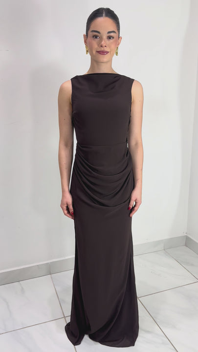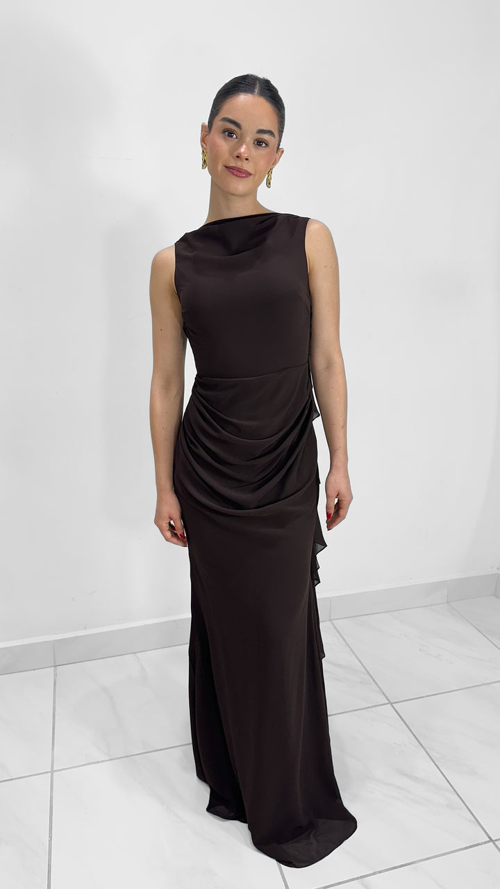 Vestido largo drapeado color chocolate